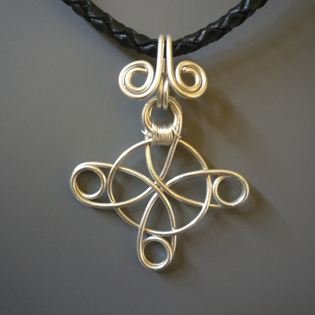 Celtic Rose Knot - £45 Sterling silver wire with a braided leather necklace. Width and hieght is 3cm and the leather necklace is 42cm (16inches) long. |