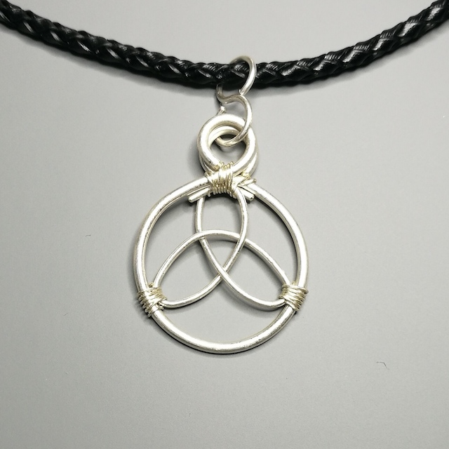 Celtic Trinity Knot - £45 Sterling silver wire with a braided leather necklace. Width is 2.4 cm and height 3.3cm. The leather necklace is 42cm (16inches) long. |